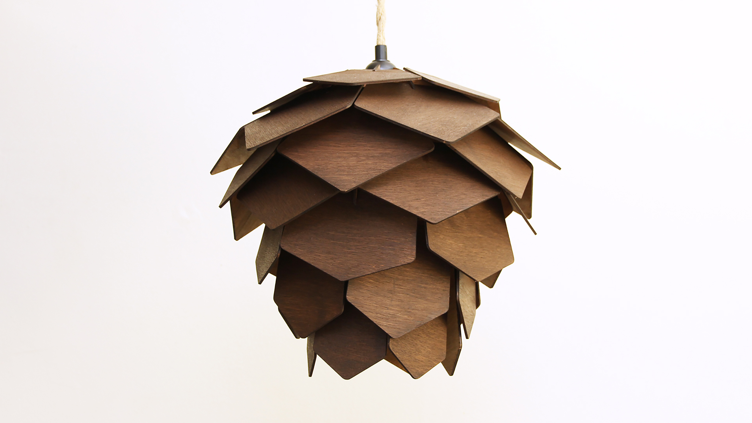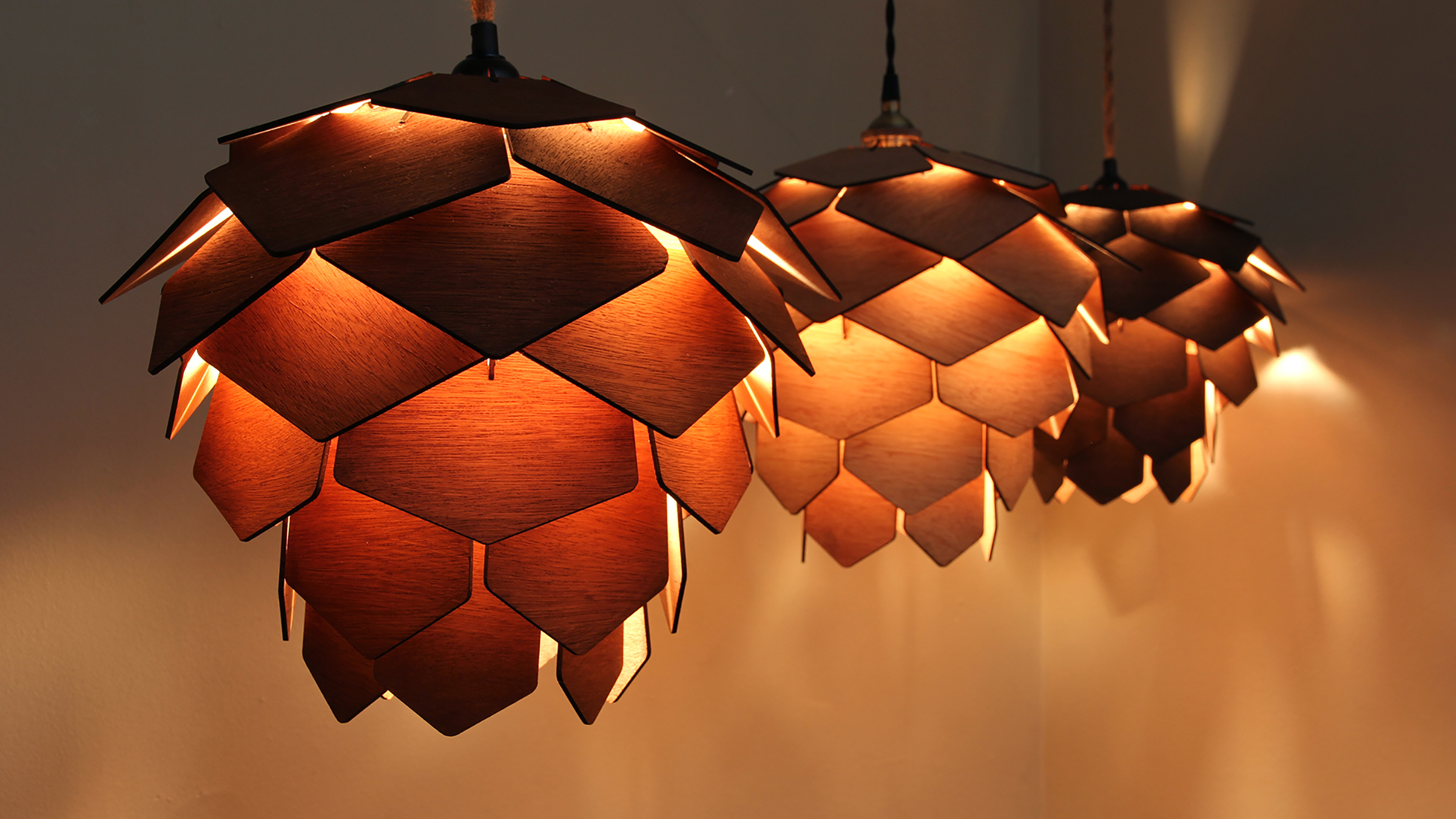 Pinecone Lamp Wood. In a white room with a buddha statue. we see three different tones of the suspended wooden picone lamp. omeech